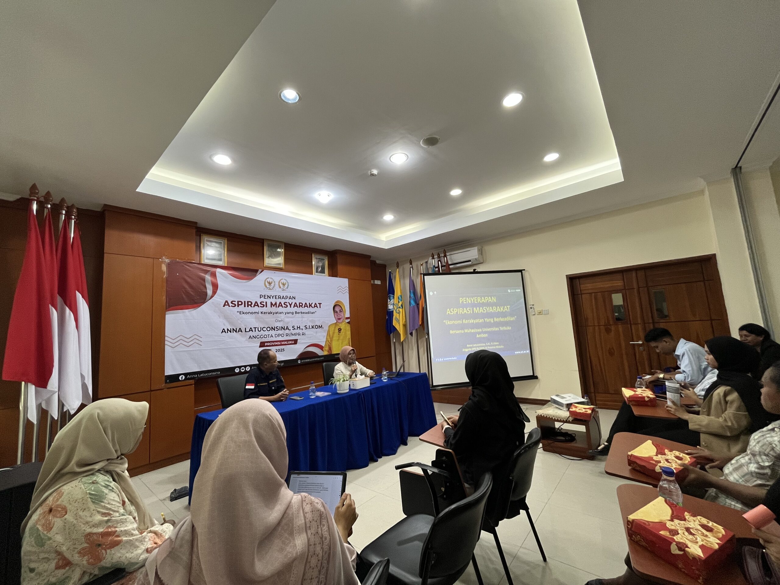 AMBON, JENDELAMALUKU.COM – Anggota Dewan Perwakilan Daerah (DPD) RI, Anna Latuconsina, menggelar kegiatan penyerapan aspirasi masyarakat bertema “Ekonomi Kerakyatan yang Berkeadilan” bersama mahasiswa Universitas Terbuka (UT) Ambon, Selasa (2/12/2025).