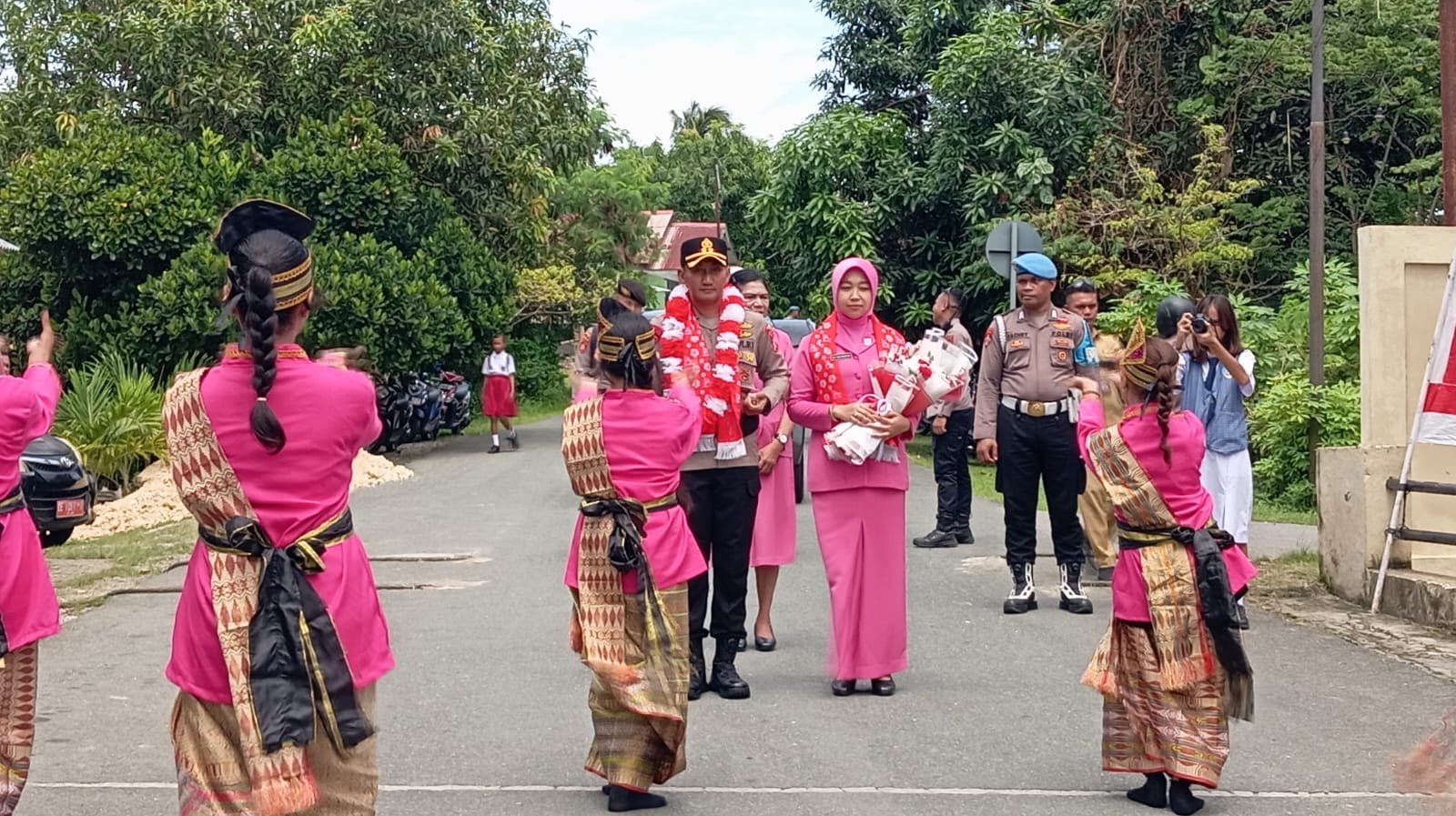 Kapolres Tual lantas disambut tarian adat oleh siswa SMPN 2 Tual.